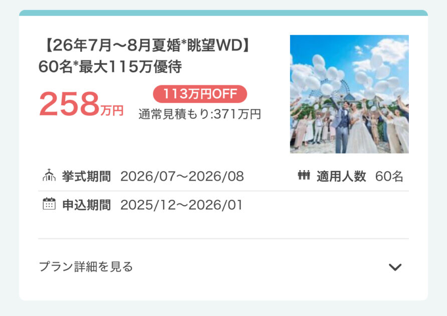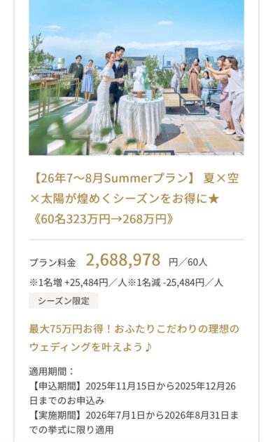 プランは先着順のことが多いため、1日でも早めに見学予約をして式場見学に行くのがおすすめです♪