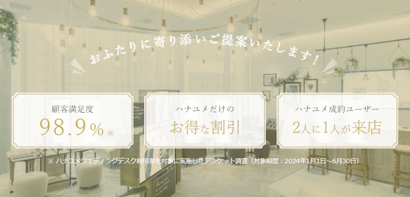 電子マネープレゼントといった独自の特典をうたっているにも関わらず、適用期間の説明が担当者から一切なく、普通にキャンペーン適用外の日時で式場見学予約になっていた。 結果、長文アンケートを回答してた後に、『見学期間が対象外でした』とのこと。は?! そもそも見学日時が適用外期間なら、他社カウンター等に相談していたと思います。 そういう大事な事は直接言わずに、お客様の確認不足ですで終了。 担当の方の知識量や対応は良かったですが、フタ開けたらこれですよね。 まとめサイトをみても、ハナユメのサクラかと思うような書き込みばかりですね。 相談した日から2週間以内とかに式場見学を3、4件できる方にはお勧めしますが、余裕をもって見学・検討したい方には全くお勧めできません。