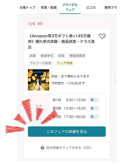 希望の日程とフェアを見つけたら、「このフェアの詳細を見る」をクリックしてください。