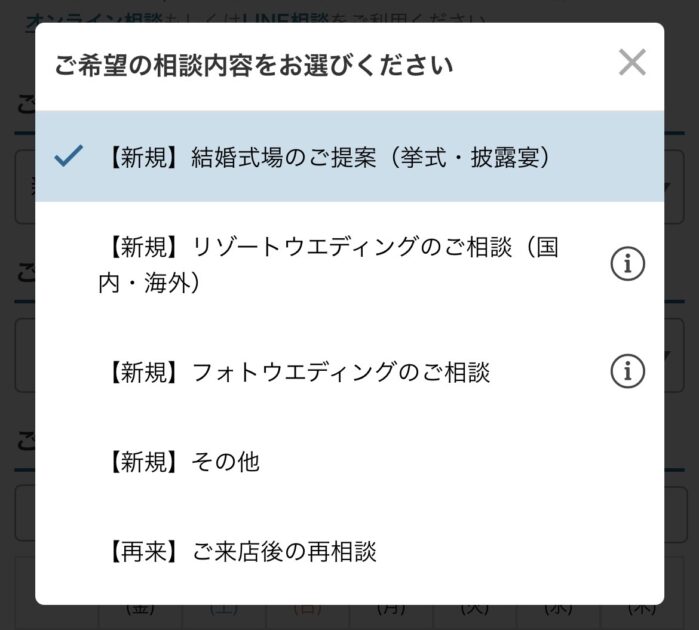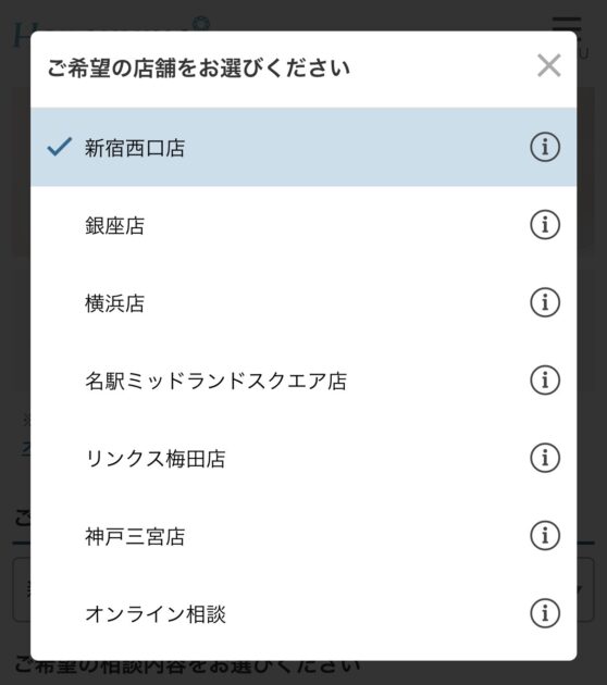 上記のような画面で希望の店舗と相談内容を選択できます。