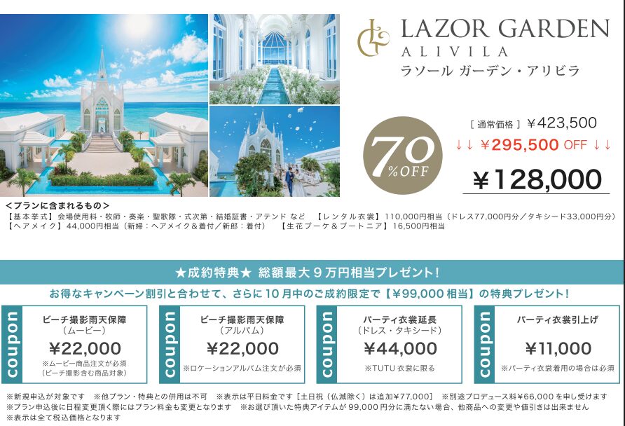 ハナユメ経由でフェアの予約をするだけで、ラソールガーデン・アリビラの公式サイトに掲載されているプランに、さらにハナユメの割引特典が付いてきます♪